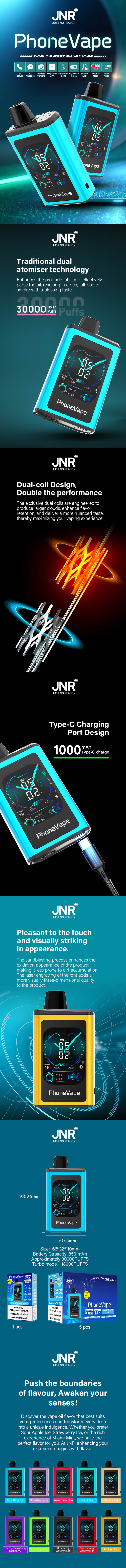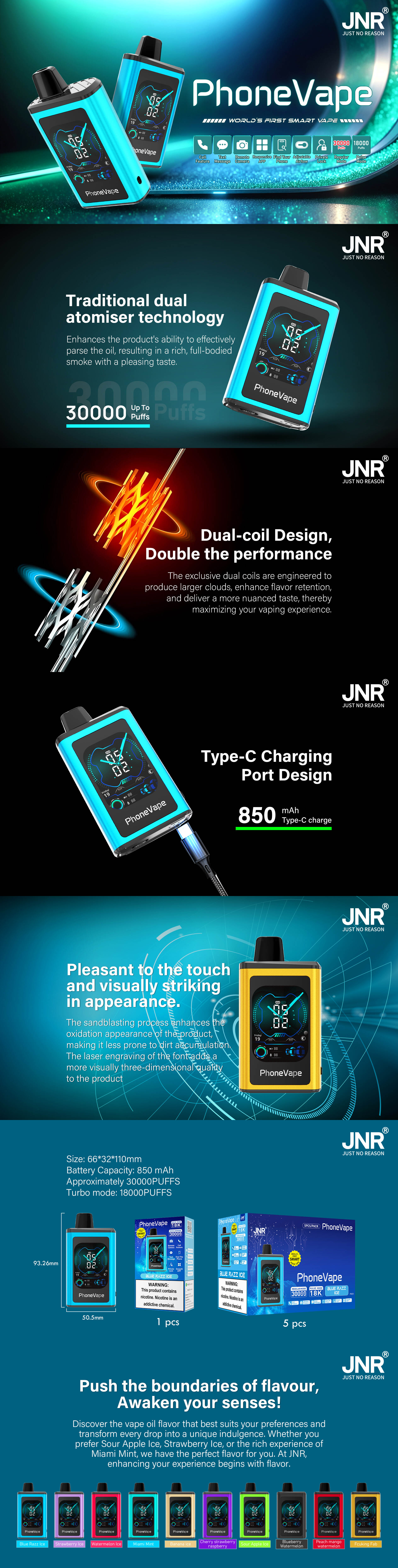 JNR PhoneVape एक टर्बो मोड के साथ आपका ऑल-इन-वन डिस्पोजेबल वेप है, जो 30,000 पफ तक है। 850mAh की बैटरी से लैस, यह केवल एक vape नहीं है - यह कॉल, फ़ोटो और संगीत के लिए एक बहुक्रियाशील उपकरण है। ई-तरल के 19 मिलीलीटर का आनंद लें और समृद्ध स्वाद के लिए एक दोहरी जाल कॉइल, अपने परफेक्ट ड्रॉ के लिए समायोज्य एयरफ्लो, और टाइप-सी के माध्यम से त्वरित चार्जिंग। 2% से 5% निकोटीन की ताकत चुनें। JNR PhoneVape: एक चिकना पैकेज में सुविधा, प्रदर्शन और शैली। विक्रय बिंदु: 850mAh टाइप-सी रिचार्जेबल बैटरी टर्बो मोड समायोज्य एयरफ्लो ऐप नियंत्रित कॉल और पाठ सुविधाएँ दूरस्थ कैमरा अपने vape क्षमता लॉक मोड पूर्ण प्रदर्शन स्क्रीन खोजें